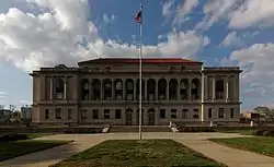 St. Joseph City Hall is a historic city hall located at St. Joseph, Missouri. It was designed by the architectural firm Eckel & Aldrich and built in 1926–1927. It is a three-story, stone and concrete building in the Italian Renaissance Revival style. It features a concrete balustraded loggia on the second level, engaged columns, arched openings, and a red tile hipped roof.[2]: 1–2