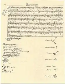 Though it was generally unpopulated to that point, the island was understood to be the territory of the Ojibwe who in time began visiting the new fort and asking about payment for the island.[18] On June 16, 1798, the deputy superintendent of Indian affairs, Alexander McKee departed Amherstburg on the Detroit River on the ship Francis to negotiate with Ojibwe chiefs for the purchase of St. Joseph Island, held under lease to that point. On June 30, 1798, the Ojibwe agreed to sell the island to the British for £1,200 Quebec currency of trade goods, an annual gift exchange and the right to continue to harvest the island and bury their dead there.[23] The St. Joseph Island Treaty, or "St. Joseph's Island Treaty No. 11" is one of the Upper Canada Land Surrender treaties conducted by the British government and First Nations in the period between the end of the American Revolution and Confederation.