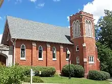 St. Mary's Chapel was added at the same time as the Classroom/Gymnasium addition.[2] It too was designed in the late Gothic Revival style. Constructed in brick, the chapel features a square bell tower on the south side that is crenelated at the top. The bargeboards are flared at the gable ends. The chapel is five bays in length and divided by buttresses. The nave is indicated by lancet windows. It is connected to St. Mary's Hall by a hyphen.