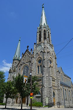 St Lawrence Church was organized at Mt. St. Mary's Seminary in 1868 under the direction of Rev. J. M. Bonner. A tract of land was purchased and a building erected which was dedicated June 12, 1870. In 1886, work was begun on the present Gothic structure, and the cornerstone was laid October 16, 1886. The basement was dedicated May 22, 1887. The superstructure was completed and the new church dedicated September 30, 1894 by Archbishop William Henry Elder. The new church is 72 × 165 feet and cost $106,000. In 1896, the congregation numbered 475 families.