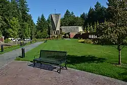 The abbey church was designed by Bennett, Johnson, and Associates of Olympia, Washington, with construction completed in 1971. It features an octagonal shape worship space and is constructed mostly of brick and western red cedar. The entrance passes through an atrium and fountain area, directed toward a distinct cross topped tower, and followed by an entrance into the central liturgical space centered around a moveable altar with chairs for the congregation. With its unique design, there are no traditional church pews, but rather chairs that allow for flexible usage of the area.[9]