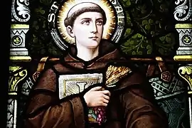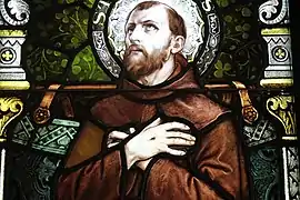 The church's Mission Revival–Spanish Colonial Revival structure supports four domes spanning the length of the Basilica. All the domes are compound design with the pendentives, following Roman architecture, transferring the weight of the roof to the pillars. The dome over the intercept point of the crossover, the nave center aisle and the apse, is topped with stained glass and features a lantern above the dome to emit light into the nave and sanctuary. The dome located over the altar is topped with a cupola designed to provide light to the altar. The two bell towers are topped with onion shaped domes, typical of the churches of Bavaria and Austria, where Fr. Novatus Benzing, the Pastor at the time, and Br. Leonard Darscheid, the Architectural Consultant, both originated. The towers house four bells which ring daily. The renowned Gothic-style stained glass collection was manufactured by the Emil Frei Studio of Missouri. The large upper windows depict scenes from the life of the Blessed Virgin Mary, while the lower nave and transept windows depict images of popular Saints of the Franciscan Order and of the heritage of the cultures represented in the community at the time (German, Spanish, Irish). Also noteworthy are the Stations of the Cross by the Andrew Kaletta Studio of St Louis. Rather than simply being painted, they are cast in high relief on a gold background which causes the figures and their detailed features to stand out prominently.