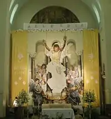 In 1992, renowned Chicano muralist George Yepes donated a large, three-panel canvas mural of the Resurrection of Jesus Christ painted with trompe l'oeil elements.[7] The mural features a resurrected Christ where the Church's crucifix currently stands. The mural is painted on three large canvas panels and has a custom wooden, steel, and metal frame on which the canvas is stretched. The mural is occasionally displayed during Easter Vigil services.
