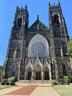 Built primarily of sandstone,[1] St. Mary's is a high Gothic Revival structure with a facade of two nearly identical towers and a Latin cross floor plan. The entire building measures 185 feet (56 m) from north to south and 85 feet (26 m) on the sides.[2] Sculptures are placed in small alcoves on the second stories of the towers and at the peak of the front gable, while windows and belfries occupy the higher stories of the towers. The main entrance comprises three adjacent portals underneath a large rose window at the center of the facade. Both the buttresses and the corners of the towers rise to decorative finials, while a large cross crowns the front gable.[4]