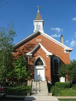 Mass was first celebrated in Mechanicsburg in 1859,[5] the parish was canonically erected in 1865,[6] and it gained a more permanent organization in 1880.[3]: 513 By the end of the 1880s, the parish had witnessed the completion of its church building on Walnut Street. In its earlier decades, the membership included many families who lived in the countryside surrounding Mechanicsburg, and the members' devotion to their church prompted a local author to declare them "extremely faithful in attendance on its services".[5] The parish obtained a rectory in October 1904; a woman who lived on Walnut Street died in that month, and her will included a provision donating her house for use as a rectory. By 1917, the membership consisted of 38 families comprising 135 individuals. The parish operated a Sunday school and multiple small groups for various activities, including a branch of the Society of the Holy Name.[3]: 514