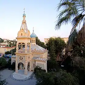 St. Michael the Archangel Church, Cannes is an Eastern Orthodox church in Cannes, France (40 Boulevard Alexandre III). The parish of the church has been, for most of its history, under the jurisdiction of the Archdiocese of Russian Orthodox churches in Western Europe, an exarchate of the Ecumenical Patriarchate of Constantinople from 1931 until November 2018; in September 2019, the parish switched to the jurisdiction of the Moscow Patriarchate.