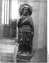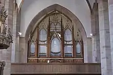 The church features notable art works, including stone sculptures by Conrad von Einbeck, who rendered the church's patron saint as Schellenmoritz (Bell Maurice) in 1411.[5][7] He created Schmerzensmann (Man of Sorrows) in 1416, Klagende Maria (Mourning Mary) in 1419, Christus an der Geißelsäule (Christ at the Column) in 1419, and a bust which is possibly a self-portrait, but more likely the portrait of one of the donors.[5][8] The late-Gothic high altar dates from 1511. The Renaissance pulpit was created by Master Zacharias Bogenkrantz in 1592, with a Schalldeckel added by Valentin Silbermann in 1604. The present organ was built by Sauer Orgelbau in 1925 and inaugurated by Thomaskantor Günther Ramin.[9]