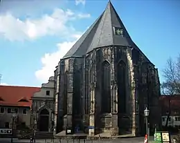 The church was built on the site of an earlier Romanesque church from 1388, dedicated to St. Maurice. The eastern part was built first, while the earlier church was still in place. The first builder was Conrad von Einbeck, followed by Hans Brochstete, Nickel Hoffmann and others. The church was consecrated in 1411.[1] The design planned a steeple in the west which was never built. The interior was completed by 1557.[2][3][4]