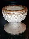Much of the church's inventory has been retained over the centuries. The smallest of the three bells dates from 1300 and was cast in Germany. The Mariaklokke (Mary's Bell) with a Hail Mary inscription was probably cast in Greifswald in 1434. The largest bell, originally from around 1500, was recast in 1903. Carved in Gotland limestone, the decorated hemispherical font dates from the 14th century. The large chandelier was made in Lübeck in 1620.[1]