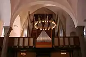 Today's church is built on the site of a much smaller building from c. 1275 known as Knuds Kirke (Canute's Church). Some of its foundations can still be seen on the northeast corner of the church. Around 1350, as Rønne gained importance, the church was extended towards the west almost doubling in length. A tower on the west end was added in 1550 but was rebuilt in 1699. Galleries were added to accommodate the growing congregation. In 1797, the north transept was added. From 1915 to 1918, major extensions were made, as far as possible without altering the style. The building was widened and a southern transept was completed.[1] Further restoration work was carried out in 1982–83 when the floor of local Paradisbakke granite was laid throughout the church.[2][3]