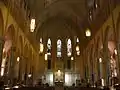 The church features Gothic Revival architecture, with ribbed vaults, pointed arches, a central nave and two side aisles of lower height. The nave follows the basic Gothic pattern with a triforium and clerestory-like top tier.