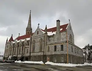 After the parish's founding, masses were held for many years in a basement church designed by James Murphy or Providence, RI. Around 1910, the massive superstructure was added by Dwyer and McMahon of Hartford, CT.[1]