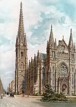 When the congregation outgrew the old church, minister Gustav Adolf Fricke and the church council decided in 1876 to build a new church. A property at the Schlettenplatz, south of the old city, was exchanged for the property of the old church. Eighty architects from all over Germany responded to a competition in 1877. The designs by August Hartel and Constantin Lipsius were chosen. Construction began in March 1882; the Grundsteinlegung (laying the foundation stone) was celebrated on 17 September that year.[3] It was dedicated on 27 December 1885.[4] The interior painting and stained glass windows were completed in 1886.[5]