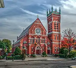 St. Peter's is located on the south side of Main Street in southwestern Worcester, directly opposite the main Clark University campus. It is a red brick structure with granite trim and ornate Gothic Revival styling. It is basically rectangular, with a square tower projecting from the right front corner and a central projecting section on the main facade. The tower has two narrow round-arch windows in the first three stages, this in the third (belfry) stage taller. It is topped with ornate crenellations and spires. The main facade has three entrances, one in the projecting section, and one each on either side. The central entrance, set in a round-arch opening, is under a gable-roofed projection, with a row of round-arch windows set pairwise in round-arch recesses. The flanking entrances are also set in round-arch openings, with circular rose windows on the second level.[2]