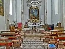 The church has one nave with a Gothic-cross-ribbed vault. The lateral windows are also Gothic with the typical pointed arches. Nevertheless, the main facade with the Renaissance elements on the portal and the three-leaf semicircular top as well as the semicircular apse reveal a recognizable Renaissance style.