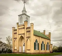 The building is a one-story, stepped gable-roofed, three bay by three bay church in the Gothic Revival style. It measures 30 feet (9.1 m) by 50 feet (15 m) and the recessed chancel measures 20 feet (6.1 m) by 10 feet (3.0 m).[4] The exterior is made of the original stucco, coursed ashlar, and brick, while the foundation is made of brick and stone.[3][4] The standing seam metal roof is flanked on either end by parapet walls. The cupola is made of wood and features Gothic style vents, an octagonal belfry with Gothic arches, pyramidal roof, and a wooden cross.[3]
