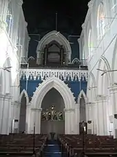 Three stained glass windows located at the apse are dedicated to three figures in Singapore's early colonial history and who are represented on the windows by their coats of arms. The window at the centre is dedicated to Sir Stamford Raffles, the windows on the left to John Crawfurd, the first major Resident of Singapore, and the windows on the right to Major General William Butterworth, the governor who initiated the construction of the second church building.[20] However, the original stained glass windows were damaged during the Second World War.[7][21] MacPherson is remembered in the grey and red granite memorial monument surmounted by a Maltese cross in the grounds, and by the stained glass window over the west door. Jalan Klapa was also renamed MacPherson Road in his honour. The gallery at the West end was not part of MacPherson's plan but added after the Cathedral opened. It has the only decorated elements in the church, with foliated pillars and pilasters, and crocketed arches.[7]