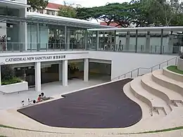 A project to extend the building was initiated in 2003. An archaeological excavation was conducted on its grounds in 2004 by the National University of Singapore before building commenced.[13] The extension, called the Cathedral New Sanctuary, was completed in November 2005. It was largely built underground to comply with conservation guidelines for a gazetted national monument, and features a new worship hall within two underground levels of new floor space.[6]