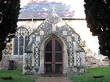 The 15th century south porch is in fine knapped flintwork, and its entrance elevation has elaborate flushwork incorporating saltire crosses and stone tablets depicting shields and emblems of St Andrew. Above the portal is a niche containing a low-relief representation of the saint holding his cross. The roof timbers are original. The church doorway within is in the Transitional style -Norman, but with a pointed arch dating to c. 1200. The doorcase is framed in an arch springing from a pair of engaged columns with waterleaf capitals, and which has two orders of roll moulding under a hood mould with billets (little decorative blocks). The holy water stoup survives.[8][9][10]