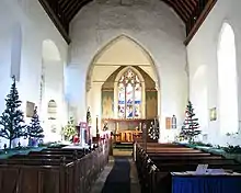 The present nave dates from the start of the 13th century. The chancel was added in the 14th century, and the edifice had a makeover in the 15th when the present tower was added.[5] There was a restoration in 1844, when the chancel's piscina and a statue niche next to the chancel arch were discovered behind plaster and cleaned out.[6] Another restoration in 1868 replaced the thatched roofs with slate.[7]