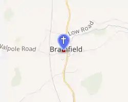St Andrew's Church is a 13th-century church in Bramfield, Suffolk. It has a separate 12th-century tower standing in the church grounds. It is one of 38 existing round-tower churches in Suffolk and the only detached example in the county. The ground before the altar of the church is paved with a number of fine ledger slabs of members of the Rabett and Nelson families.