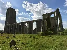 This is constructed in random flint rubble with stone dressings. Its plan consists of a nave, a chancel, north and south seven-bay aisles, a north sacristy, and a west tower. The tower is still intact and is in three principal stages, with buttresses and a battlemented parapet. On the south side of the middle stage is an ogee-headed opening. There are bell openings on each side of the top stage, but their tracery is missing. The wall of the south aisle is more complete than the north wall, and contains six intact window openings. The chancel projects one bay beyond the aisles, and contains tall window openings in its north and south wall, and a large east window opening. The buttresses at the east end are decorated with chequered flushwork, and contain canopied niches for statues. Some of the carved corbels for the chancel roof are still present.[1]