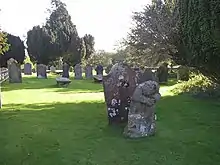 In the churchyard are four carved bears standing upright in different postures. They date from the medieval period, are in red sandstone, and each is about 4 feet (1.2 m) high. They are thought to stand in the four corners of the original churchyard, but otherwise their meaning and purpose is unknown. Each bear is listed at Grade II*.[5][6][7][8] Also in the churchyard is a sandstone alms table supported by six pillars. It contains a brass sundial with an inscription containing the date 1732–3, but no gnomon. It is listed at Grade II.[9]