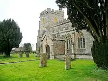 There are several Grade II listed structures, enlisted 7 February 1986, in and by the churchyard. The Gillet Monument is a late-18th-century altar tomb with an obelisk made of hamstone and it is located in the churchyard, 17 m (56 ft) southwest of the tower.[9] The Swain Travers Monument is also located in the churchyard, just east of the chancel; it is a 19th-century chest tomb, a possibly reuse of an 18th-century tomb.[10] An unidentified late-17th-century monument in the churchyard is located just south of the chancel.[11]