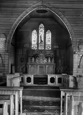 Internally, the church retains its timber boarded floor and ceiling. The ceiling is raked, flattening out halfway, and has round carved timber ventilation panels. The scissor tie-rods to the roof structure are exposed.[1]