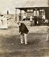 Before 1860, there were few recreational activities that young women could participate in, apart from croquet, battledore and shuttlecock, and archery. At that time, the caddies of St Andrews laid out a small putting area on the Links behind Gibson Place, which is close to the present-day Rusacks Hotel.[4] The club originated as a group of local St Andrews ladies that included Miss Ellen Boothby, her sister-in-law Mrs Robert Todd Boothby, Mrs Skipworth, Miss Deane and Miss Chambers, who met regularly on the putting green.[4] Many of the ladies’ fathers or brothers were members of the Royal and Ancient Golf Club, and the ladies would play on the Old Course when it was quiet. There had been growing friction between the ladies and the caddies, who believed that the ladies were taking over their space on the links. Consequently, by 1866 the ladies felt that they should have their own links and club, and so in 1867 the St Andrews Ladies Golf Club was established with Mrs Robert Todd Boothby as President and Miss Ellen Boothby as Vice President.[5]