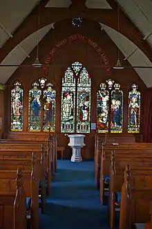The church is set in woodland and is surrounded by a cemetery. Otago's first Anglican Bishop, Samuel Tarratt Nevill was buried here in 1921.[1] A traditional lych gate marks the entrance from Coast Road. The church is built in board and batten with a wooden shingle roof and a small copper-tipped tower, fitted with a bell inside. The stained glass windows are unusually elaborate for such a small building. They depict among others St. Joan of Arc and Christ the Redeemer. They have been said to have been ordered for a Roman Catholic church in Brisbane but diverted to Dunedin following a waterfront dispute.[1] However recent research has found this to be mythical, and the real story of their original destination is even more complicated and interesting. The building is listed as a Category II Historic Place.[3]