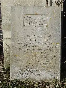 The churchyard is notable as the resting place of Jethro Tull, the 18th-century modernising farmer, whose modern gravestone can be seen there. He died in 1741 but according to his gravestone, he was buried on 9 March 1740. This apparent confusion is due to the burial date being in the Old Style.