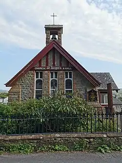 The church was built from the local red and grey sandstone, topped with a slate roof. The church has a bellcote with one bell. The interior space comprises a Nave. The windows are all opaque and pews are moveable.[4] The terracotta, triquetra font, from an earlier church, has triquetras and floral carvings. The church has no churchyard.