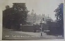 The hospital was established in a disused Roman Catholic College building as the Tooting Home for the Aged and Infirm in 1897.[1] During the First World War it served as the Church Lane Military Hospital (also known as the Tooting Military Hospital), with 712 beds for injured soldiers evacuated from the fighting in France.[2] After the war it became a home for soldiers suffering from shell-shock.[1] It closed in 1923 but was re-opened by the London County Council in 1930. [1] It admitted three classes of patients: convalescents or those needing rehabilitation; the aged chronic sick; and young adults who were permanently incapable.[1]