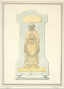 He further remarks that the monumental brass, which is the only one in Montgomeryshire, was previously attached to a great slab or chest of oak, that was still in place in the church.[4] Pennant intended to republish this Tour with more illustrations and employed the artist John Ingleby to provide watercolours for illustrations, which are now in the National Library of Wales. In 1796 Ingleby provided a view of the Church with its Campanile, a drawing of the Brass and a translation.