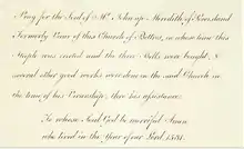 In July 1775 Thomas Pennant visited Bettws Cedwain with his friend Arthur Blayney of Gregynog Hall. An account of the church was included in his Tours in Wales and provides useful information about the appearance of the church at the time. He remarks The steeple makes a figure in these parts. It was built by one of its ministers: whose figure, in priestly vestments, carved on a brass plate which is fastened to one of the walls. He then records the Latin inscription to the priest, John ap Meredyth, who died in 1531 and in whose time the steeple or campanile with three bells was added to the top of the tower.