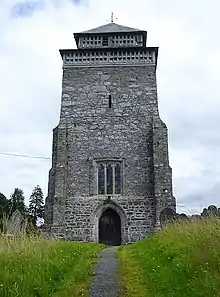 The only feature of Perpendicular style is the three-light west window set in the tower and the Tudor drip mold over the window suggests it is very late in the Perpendicular period. The lower courses of the tower are earlier, and a late Romanesque/Transitional period west tower door is set into these courses. This may indicate that the tower was originally built in the earlier part of the 13th century, either before or at the time that the church was appropriated by Strata Marcella.[8]