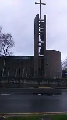 Historically, Richmond was a sparsely populated area forming the western end of the Handsworth parish. The Woodthorpe estate was constructed in the area from the 1930s, and in 1935, a chapel-of-ease was constructed to serve its population.[2] It was a temporary structure of corrugated asbestos at the junction of Richmond Road and Hastilar Road.[3] In 1949, a parish was created for it,[2] but the local population had increased to more than 10,000 people, and the church was considered insufficient and in need of replacement. Frederick Etchells was commissioned to design a new church, to seat 500 people, but although he produced drawings, there was initially no money available to construct the building.[3]