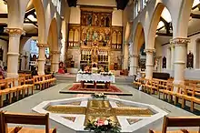 John Francis Bentley added the present reredos, high altar and communion rails in 1870/73. The reredos, which is thirty feet high, has two tiers of saints painted on slate by Nathaniel Westlake. The frontal for the Lady Chapel altar was added in 1879.