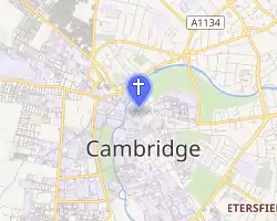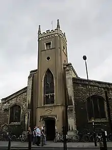 The church is located in Bridge Street, Cambridge, part of the central Cambridge conservation area.[1] The churchyard provides a green oasis in the street.[2] The small parish contains many historic buildings, including the Old Vicarage,[3] which adjoins the churchyard.