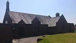 The Church was built in 1914. The foundation stone was laid on 21 March 1914. The first service was held in the Church in January 1915.[2] The building was initially intended to be the Church Hall and the main Church building was to be built in front on the field. However the parish ran out of money and the hall, which was built of Ellesmere Sandstone with the inside lined with Ruabon brick, was converted into the church and a small hall built next to it, which is now known as the Institute.[3] The field is used for Church Fetes and other events.