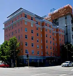 The site of the building, on the corner of Hereford and Montreal Streets, was occupied by the St Elmo Boarding House. It was advertised as "superior private accommodation".[1] A replacement building, St Elmo Courts, was designed in 1929 by B. J. Ager.[2] This reflected a movement in the larger New Zealand cities in the 1920s and 1930s for apartment living. The appeals were inexpensive living in a central location, with apartments offering modern conveniences and built in furniture.[3] St Elmo Courts was constructed in 1930.[4] Accordingly, St Elmo Court provided bedsits and two-bedroom apartments. Many of those were later converted to office space.[5]