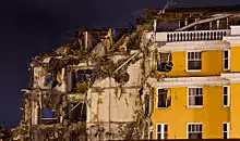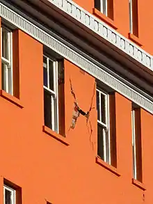 St Elmo Court had a light reinforced concrete frame that was infilled with masonry. Following the 4 September 2010 earthquake, diagonal shear cracks were visible in the façade in the vertical piers.[8] One column had a shear failure. The damage became more extensive in the 22 February 2011 earthquake.[9]