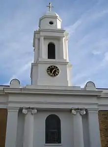 Busby designed St George's Church in a Neoclassical style, with simple clean lines and strong symmetry.[4] The exterior consists of yellow brick with some stucco work, regularly spaced tiered pairs of round-headed windows, and a deep cornice with no ornamentation. The western face, where the entrance is situated, has Ionic columns and pilasters on each side of the door, and a central tower topped by a cupola with a small cross.[4] Clock faces were added on each side soon in 1840.[4][5] Inside, there are galleries at the northern, southern and western sides, reached by curved staircases. There was a three-tier pulpit in front of the reredos at the eastern end, and the organ, by the J.C. Bishop & Son organ builder firm, was initially inside the western gallery.[4][10]