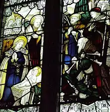 The church has late 19th- and early 20th-century stained glass. The oldest window is in the north wall of the chancel, designed by the Jones & Willis firm in about 1892. Charles Eamer Kempe designed the east window of the chancel in 1895; it depicts the Crucifixion of Jesus. Another Jones & Willis window, dating from 1895 and depicting Faith, is in the crossing, and they also designed a second window in the north wall of the chancel in about 1908. The west window of the nave has Kempe glass from 1905 depicting the Presentation of Jesus at the Temple, and his firm Kempe & Co. installed stained glass in the north aisle in 1910 and 1925 and in the nave in 1919 and 1926. Later windows include Morris & Co. and Wippell & Co. designs of 1950, both in the north aisle, and a 1956 design by the Barton, Kinder and Alderson firm in the north wall of the chancel.[7][19][30]