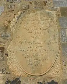 Also buried in the churchyard is Henry Piggott, a member of the locally prominent Piggot(t) family. His "seemingly very odd memorial"[9] by the southwest corner of the chancel[47] states that he was born on 30 December 1715 and died on 7 March 1715.[34] The gravestone is an example of the use of Old Style (Julian calendar) dates in the period before 1752, when the Gregorian calendar was introduced. The new year started on 25 March rather than 1 January, so Henry Piggott lived for about nine weeks.[9][34][47]
