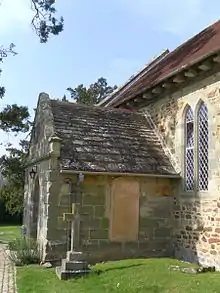 More changes took place in the early 14th century, by which time English Gothic architecture had moved into its Decorated Gothic phase.[9] A new wider chancel arch was installed between the crossing and the chancel, a side chapel was added on the north side, new windows were added in the nave, and the original rounded west arch of the crossing (into the nave) was replaced by a new pointed arch.[6][7][9][14][16][17] The side chapel probably replaced the old north transept, which was removed "for some reason unknown";[14] its roofline can still be traced.[7] All of this work apparently took place between 1320 and 1330.[14] One contemporary feature that has now disappeared was a chantry chapel dedicated to Marie de Bradehurst. It was built alongside the chancel and was latterly used as a schoolroom until it was removed in the Victorian era.[17] The dedication relates to the Broadhurst manor in Horsted Keynes parish. The demolition of the chapel revealed the outline of a wide blocked pointed arch on the south wall, which is still clearly visible.[18]