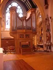 Inside of the church, the stained glass windows was designed by Hardman & Co. The altar and reredos were made by Farmer & Brindley. The majority of the carving was done by Messrs R. L. Boulton & Sons of Cheltenham; a firm who also worked on Cheltenham Town Hall, St John's Church in Poulton-le-Fylde, St Mary's Church and St Alban's Church in Warrington and St Cuthbert's in Earls Court.[1]