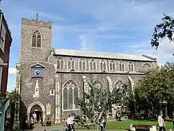 The church, which stands between Pottergate and St Benedict's Street,[2] is medieval. The body of the church dates back to a 14th-century rebuilding, although the tower is older.[3] St Gregory's is noted for its wall-paintings, which include a depiction St George and the dragon at the west end of the north aisle.