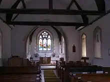 The church consists of a nave, with a south porch, chancel and tower. The nave is in three bays, marked on the outside by buttresses. The inner stonework of the windows dates from the Victorian restoration. The window in the second bay on the north has some ancient exterior stonework remaining.[1] The squat tower is rendered and has diagonal buttresses.[2] It was built around 1545, but an earlier tower may have been either planned or actually built. The evidence for this is in the sixteenth century Perpendicular style tower arch which sits on apparently fourteenth century shafts which are too small for it, leading to an awkward appearance.[1][2][3] The chancel dates entirely from the restoration of 1863.[2] It has fourteenth century style windows and a buttress in the middle of the north and south walls. The chancel arch is fourteenth century.[1][2][3]